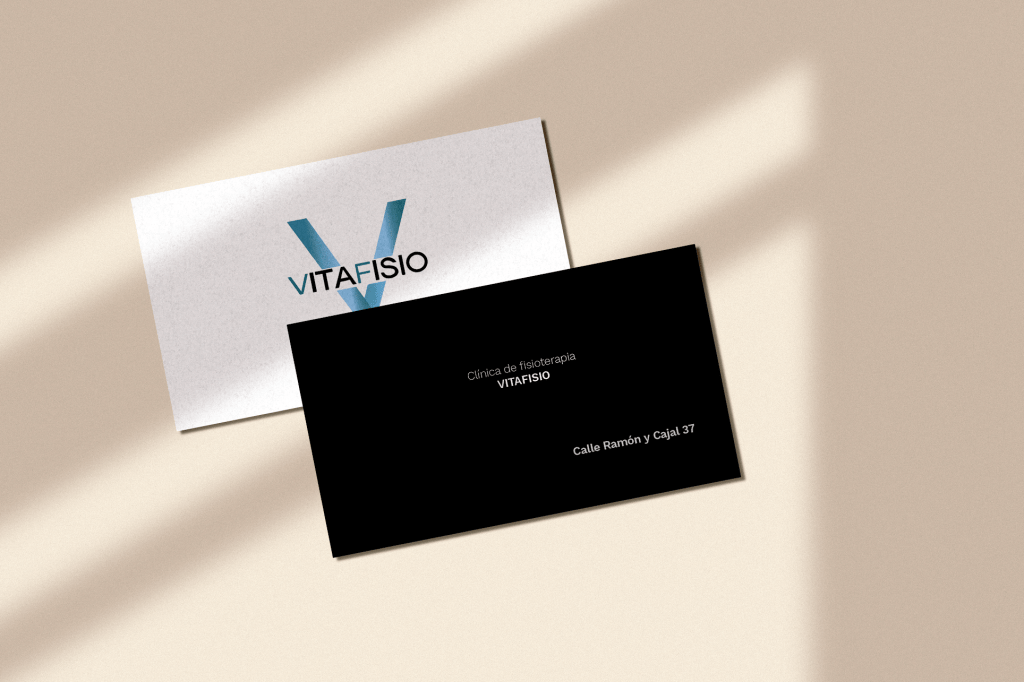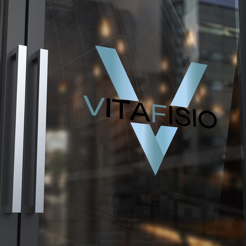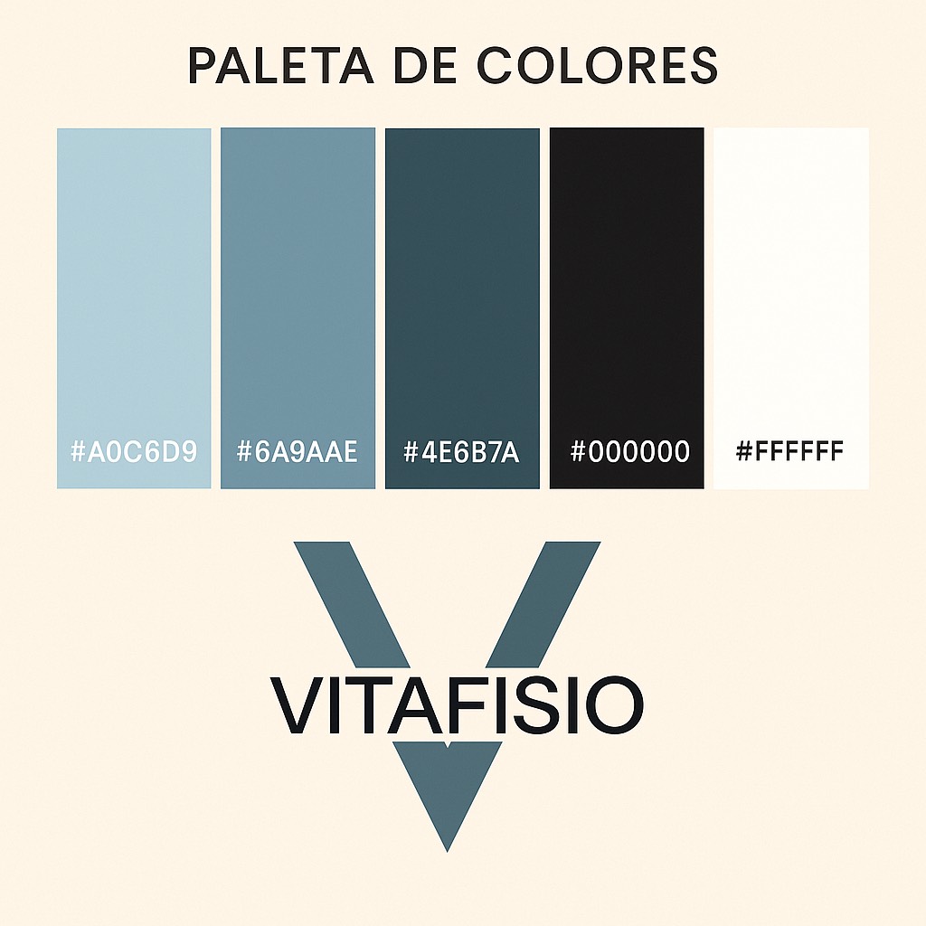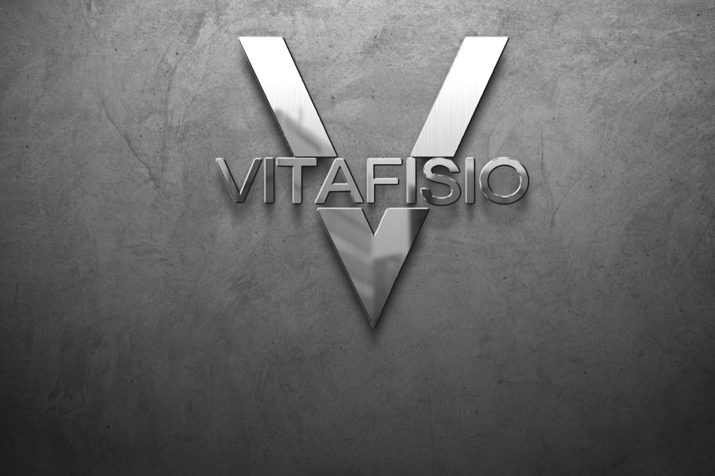 El logotipo está compuesto por una gran «V» estilizada en tonos azulados, que simboliza la vitalidad, equilibrio y dirección. Sobre esta figura se superpone el nombre VITAFISIO, con un contraste elegante entre colores sobrios y tipografía moderna. La disposición transmite firmeza y profesionalismo, mientras que los degradados añaden un toque contemporáneo y tecnológico.